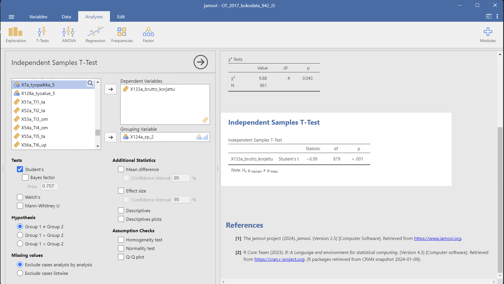 Otan esimerkin vanhasta tutkimusaineistosta, jossa vastaajilta kysyttiin mm. työkokemustaan ja palkkaustaan. Tämä mahdollisti mies- ja naisvastaajien palkkatuloerojen tarkastelun. Perinteisesti tämän erojen tarkastelun voi tehdä vaikka T-testillä. Kuvassa JAMOVIn käyttöliittymä ja ensimmäinen tarkastelun tulos. Muuttujat ja funktiot näkyvät vasemmalla, laskennan tulos välittömästi oikeanpuoleisessa ikkunassa.