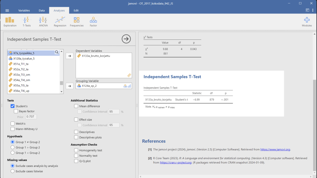 Esittelen tässä kuitenkin toisenlaisen ohjelmiston, nimeltään JAMOVI. Samantyyppinen ohjelmiso on JASP, siitä ehkä joskus myöhemmin.