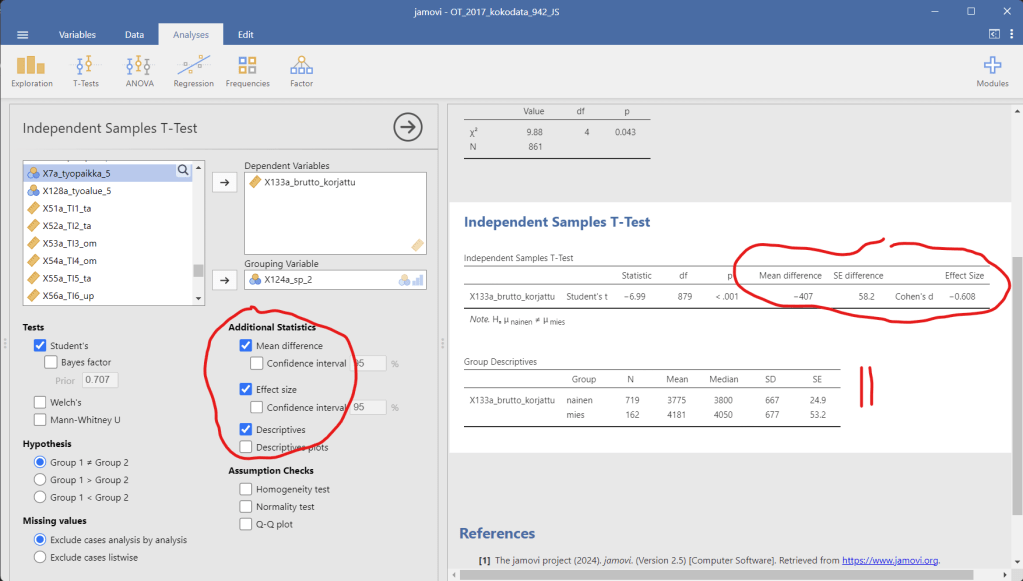 Nyt oikeanpuoleisessa ikkunassa ovat näkyvillä kuvaajat, palkkojen eromäärät sukupuolen mukaan, ja testi näyttää myös palkkojen kesiarvojen eron ja Cohenin d:n, joten ei olla vai p-arvon varassa.