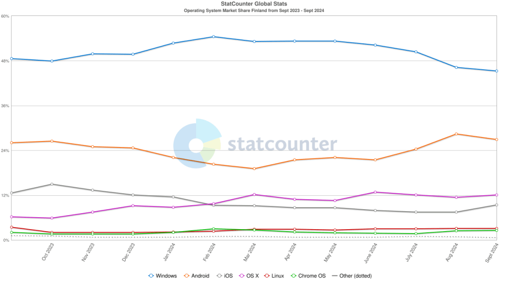 Kun katsomme Suomea koskevia laskelmia, huomaamme että me suomalaiset olemme erittäin Windows uskollisia ja että Linuxin käyttäjiä on Suomessa reilusti enemmän kuin maailmalla keskimäärin.