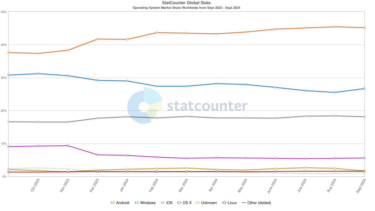 Statcounterin laskelmien mukaan yleisin käyttöjärjestelmä on Android 45 prosentin osuudellaan. Luku saadaan, kun summataan puhelimet, tabletit ja pöytäkoneet. Tämä ei tietenkään anna oikeaa kuvaa kokonaisuudesta, johon pitäisi sisällyyttää myös palvelimet ja sulautetut järjestelmät, joissa Linux ovat johtavassa asemassa.